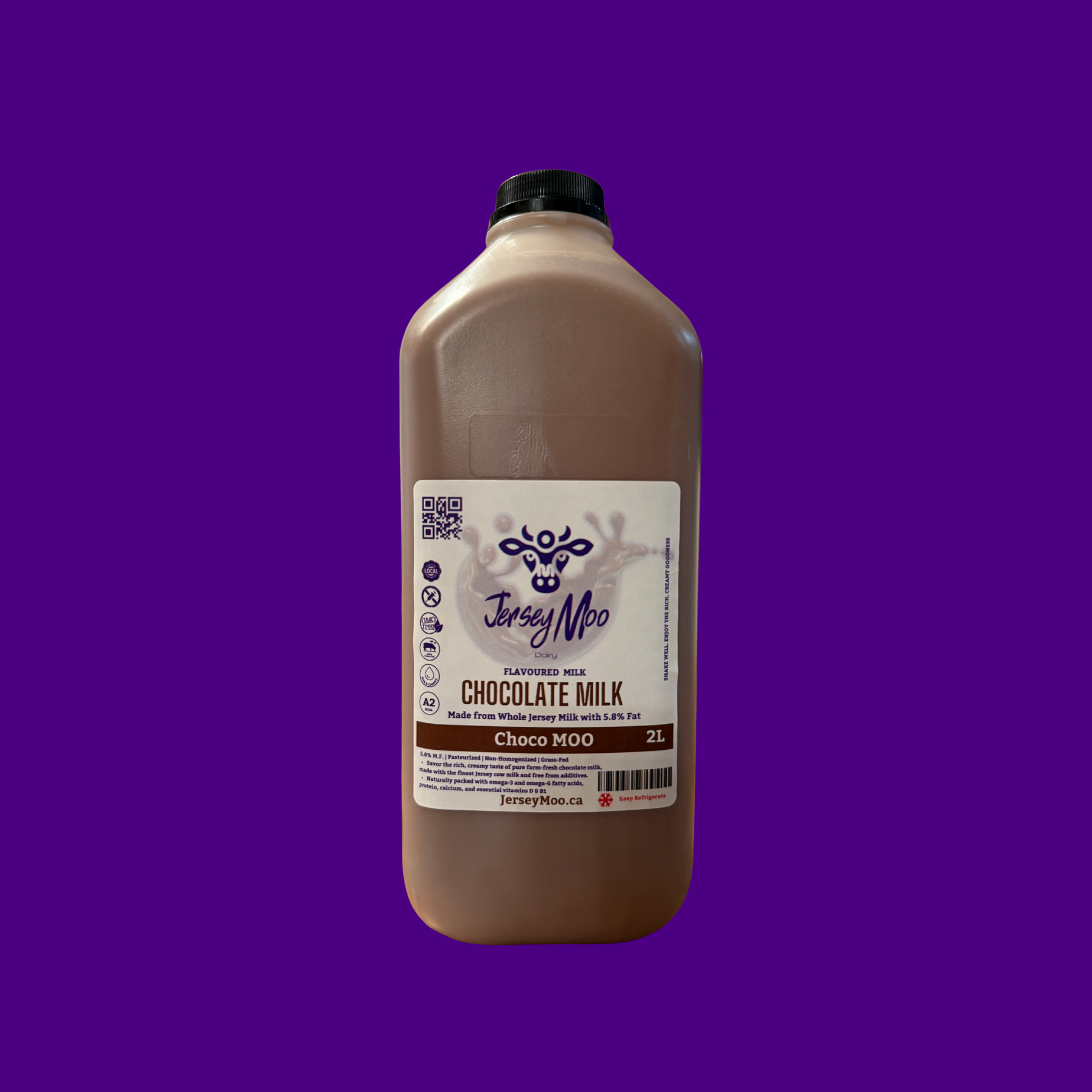 JerseyMoo ChocoMoo is a premium chocolate-flavored milk crafted from our rich, grass-fed, non-homogenized whole Jersey cow’s milk. Lightly sweetened and blended with real cocoa, this 2L bottle delivers all the indulgence of classic chocolate milk—without the artificial ingredients.